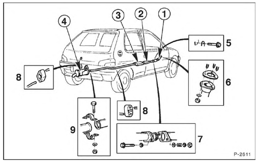 Die Abgasanlage besteht aus folgenden Teilen: Abgaskrümmer, vorderes Abgasrohr, Katalysator, Zwischenrohr mit Mittelschalldämpfer (je nach Motor und Ausstattung) und Nachschalldämpfer. Die für die Regelung des Katalysators erforderliche Lambdasonde ist kurz vor dem Katalysator eingeschraubt.