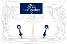 Stellen Sie, um diesen Gurt zu befestigen, die Kopfstütze des Fahrzeugsitzes hoch und führen Sie den Haken zwischen dem Gestänge hindurch. Befestigen Sie anschließend den Haken an der oberen Öse B und ziehen Sie den oberen Gurt stramm.