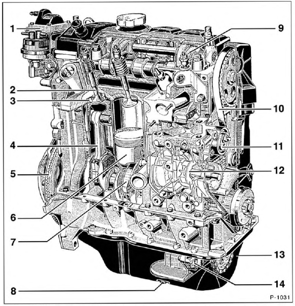 Im unteren Teil des Motorblocks befindet sich die Kurbelwelle, die von 5 Kurbelwellenlager abgestützt wird. Über Gleitlager sind die Pleuel, die die Verbindung zu den Kolben herstellt, mit der Kurbelwelle verbunden. Den unteren Abschluß des Motors bildet die Ölwanne, in der sich das zur Schmierung und Kühlung des Motors benötigte Motorenöl sammelt. Oben auf dem Motorblock ist der Zylinderkopf aus Leichtmetall aufgeschraubt.