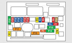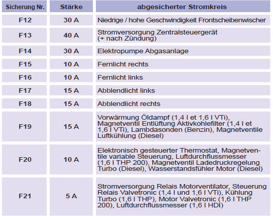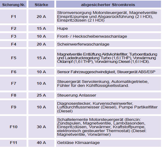 Tabelle der Sicherungen über der Batterie