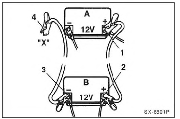 4. Das andere Ende des schwarzen Kabels an eine gute Massestelle -X-, zum Beispiel den Motorblock des Empfängerfahrzeuges, anschließen. Dadurch werden Masseverluste vermieden. Unter ungünstigen Umständen könnte beim Anschließen des Kabels an den Minuspol (-) der leeren Batterie, durch Funkenbildung und Knallgasentwicklung, die Batterie explodieren.