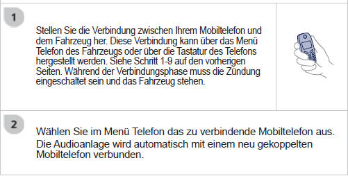 Aus Sicherheitsgründen muss der Fahrer die Bedienungsschritte zum Anschluss des Bluetooth-Mobiltelefons an die Bluetooth- Freisprecheinrichtung seines Autoradios bei stehendem Fahrzeug und eingeschalteter Zündung vornehmen, da sie seine ganze Aufmerksamkeit erfordern.